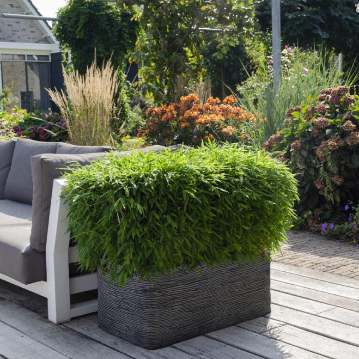 Der nicht wuchernde Bambus 'Moontears' Boobux macht sich gut in einem Kübel oder Kasten. Container oder Topf sollte dann aus einem stabilen Material bestehen, denn die Wurzeln des Bambus sind nicht zu unterschätzen.