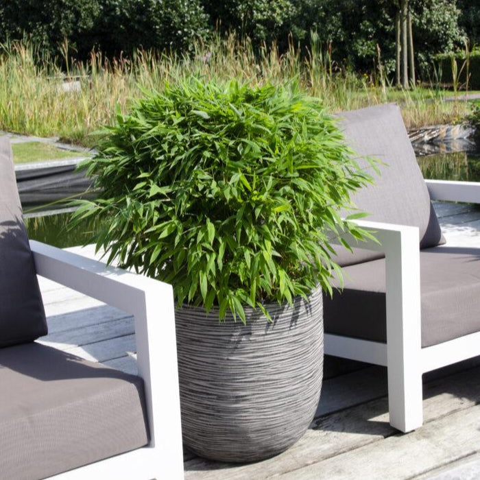Die kräftige Bambusart 'Moontears' eignet sich sehr gut für Formschnitte. Das macht diese Sorte zu einem guten Ersatz für Buchsbaum, der schnell vom Buchsbaumzünsler befallen wird. Bambus 'Moontears' hat große, volle Blätter und einen kompakten Wuchs. Rufa 'Moontears' kann auch als Hecke oder Bodendecker gepflanzt werden. Das schafft Privatsphäre und zusätzliches Grün in Ihrem Garten!