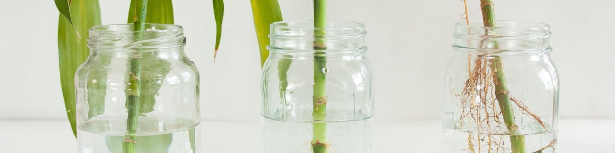Die Vermehrung von Bambusstecklingen in Wasser ist eine beliebte Methode. Besonders wenn Sie den Steckling in eine Glasvase stecken, macht es Spaß, den Prozess der Wurzelentwicklung zu verfolgen. Sie können tatsächlich beobachten, wie Ihr Steckling zu einer Pflanze heranwächst. Das Stecken von Bambus-Stecklingen in Wasser erfolgt ähnlich wie das Stecken von wurzellosen Stecklingen in Erde. Anstelle eines Topfes mit Erde stellen Sie im ersten Schritt ein hohes Gefäß mit Wasser bereit. Der untere Abschnitt Ihres Stecklings sollte vollständig im Wasser stehen können. Führen Sie anschließend die Schritte 1 bis 3 der vorher beschriebenen Methode aus. Haben Sie den Steckling von der Mutterpflanze abgeschnitten? Stellen Sie den Steckling in das Gefäß oder in eine Flasche mit Wasser.