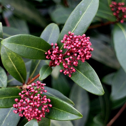 Japanische Blütenskimmie Skimmia japonica 'Rubella'Versand innerhalb von 0-2 Werktagen