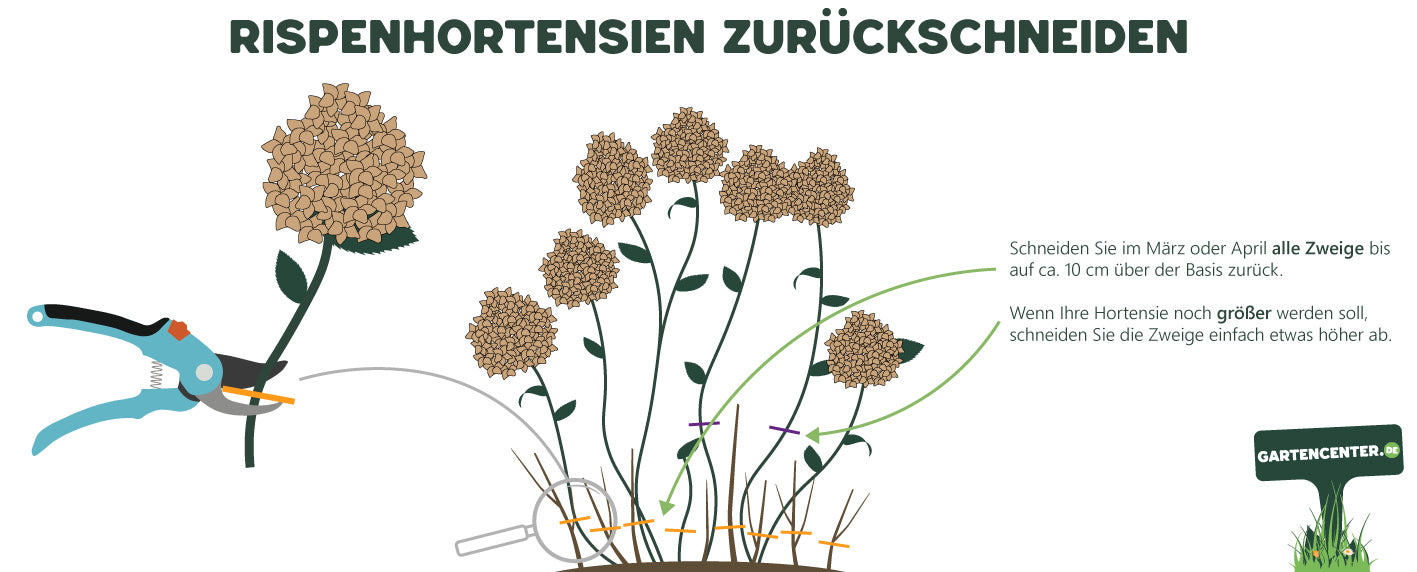 Natürlich möchten Sie, dass sich Ihre Rispenhortensie optimal entwickelt und lange schön bleibt. Deshalb muss sie regelmäßig zurückgeschnitten werden. Aber wann und wie kann man Rispenhortensien am besten zurückschneiden? Rispenhortensien blühen, wie auch die Schneeballhortensien, am einjährigen Holz. Das bedeutet, dass sich die Blütenknospen an den diesjährigen Trieben bilden. Für ein optimales Ergebnis schneidet man Rispenhortensien deshalb im Frühjahr (März/April) bis auf 10 cm über der Strauchbasis zurück. So können Sie noch im selben Jahr die reiche Blütenpracht Ihrer Rispenhortensie genießen!
