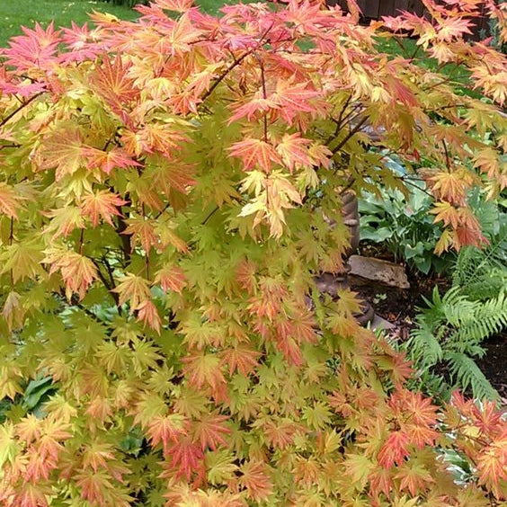 Der gelbe Fächerahorn unterschiedet sich durch seine weniger tief geschlitzten Blätter deutlich von den anderen Sorten. Die Blätter wirken großflächiger und haben leicht gewölbte Blattränder. Mit seiner auffälligen, leuchtend gelben Blattfarbe im Frühling und seinen gelb-grünen Blättern im Sommer ist der „Summer Gold“ ein wahrer Blickfang im Garten. Im Herbst verfärben sich die Blätter von Orange über Rot bis hin zum dunklen Violett und bringen eine bunte Herbststimmung in den Garten. Der gelbe Fächerahorn ist sehr winterhart und kann auch kalte Winter sehr gut überstehen.