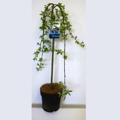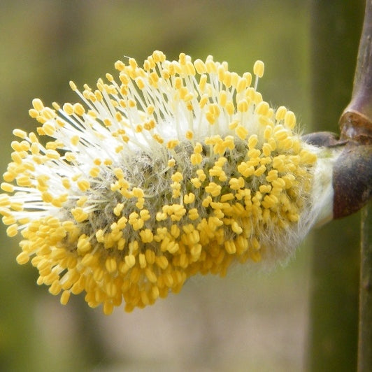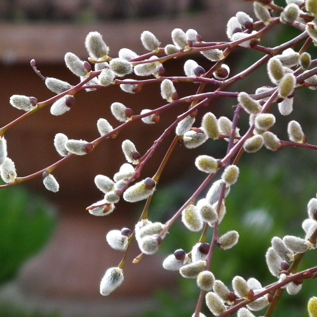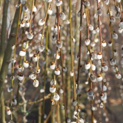Salix caprea 'Kilmarnock' (Hänge-Kätzchenweide) ist eine auf einen Stamm veredelte Weide mit einer zierlichen Wuchsform. Die gebogenen, nach unten hängenden Äste haben graugrüne Blätter. Im Februar können Sie sich bereits an den silbrig-weißen Kätzchen von 'Kilmarnock' erfreuen. Im März und April entwickeln die Kätzchen gelbe Staubgefäße, wodurch sie noch mehr auffallen.